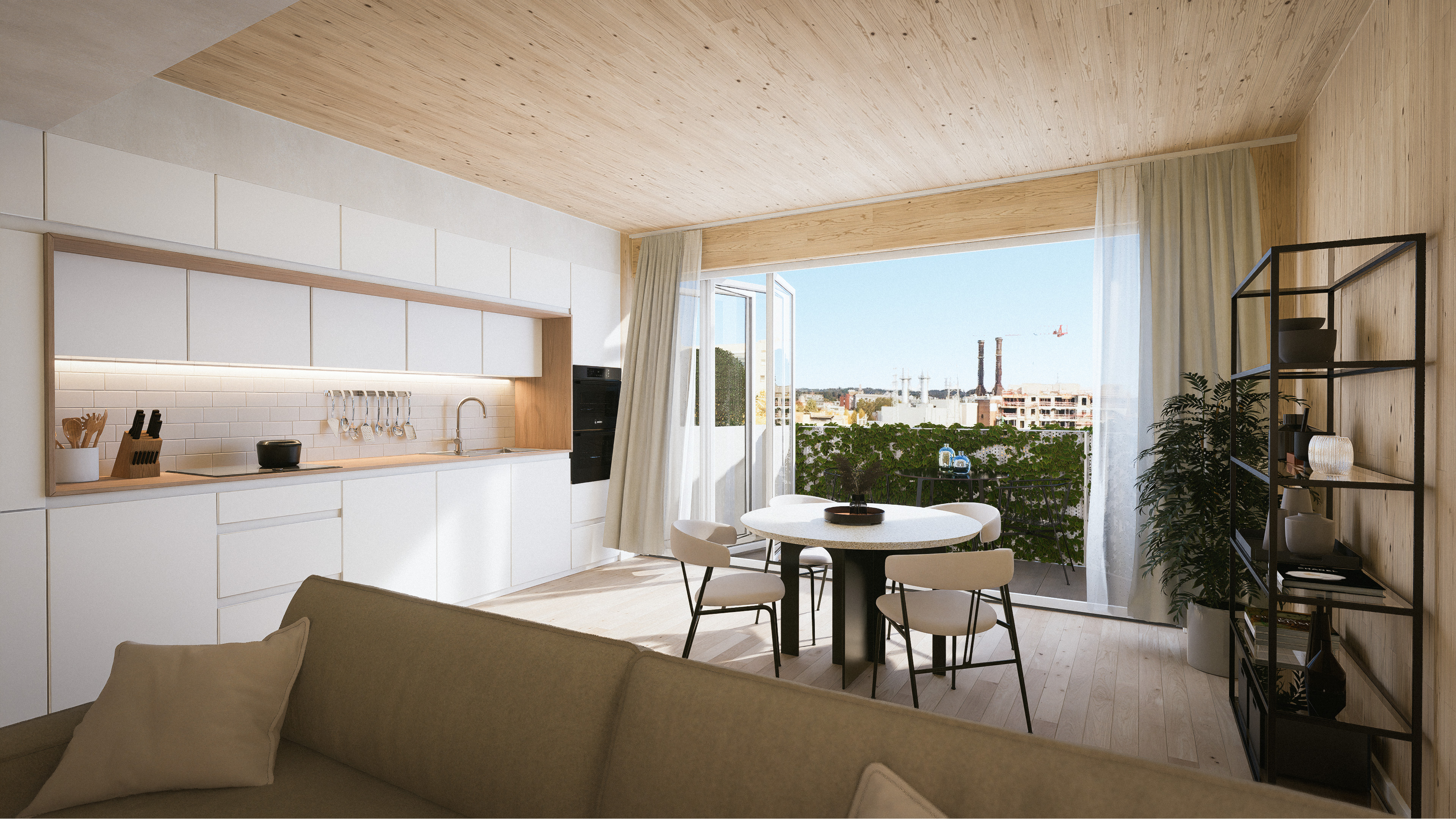 Finitions haut de gamme : plancher type parquet thermique et acoustique, matériaux écologiques et recyclés, carrelages muraux chaleureux, bois CLT visible ou en finition lisse.